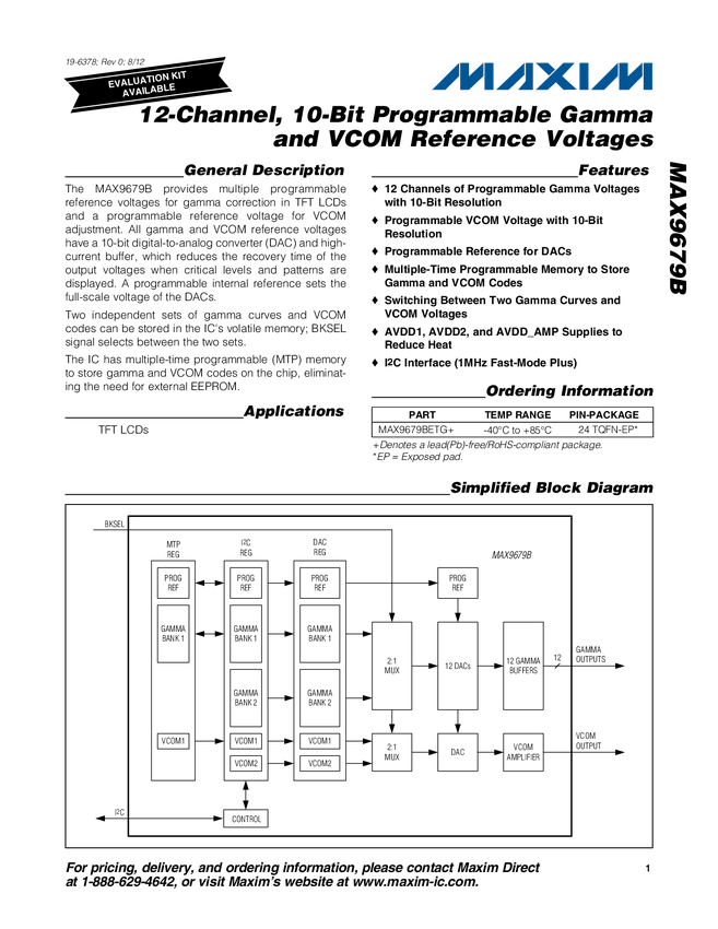 MAX9679B 12-Channel, 10-Bit Programmable Gamma and VCOM Reference Voltages