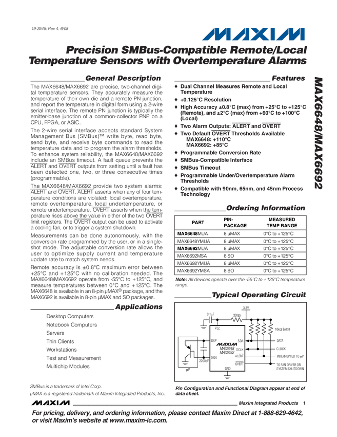MAX6648 Precision SMBus-Compatible Remote/Local Temperature Sensors with Overtemper...