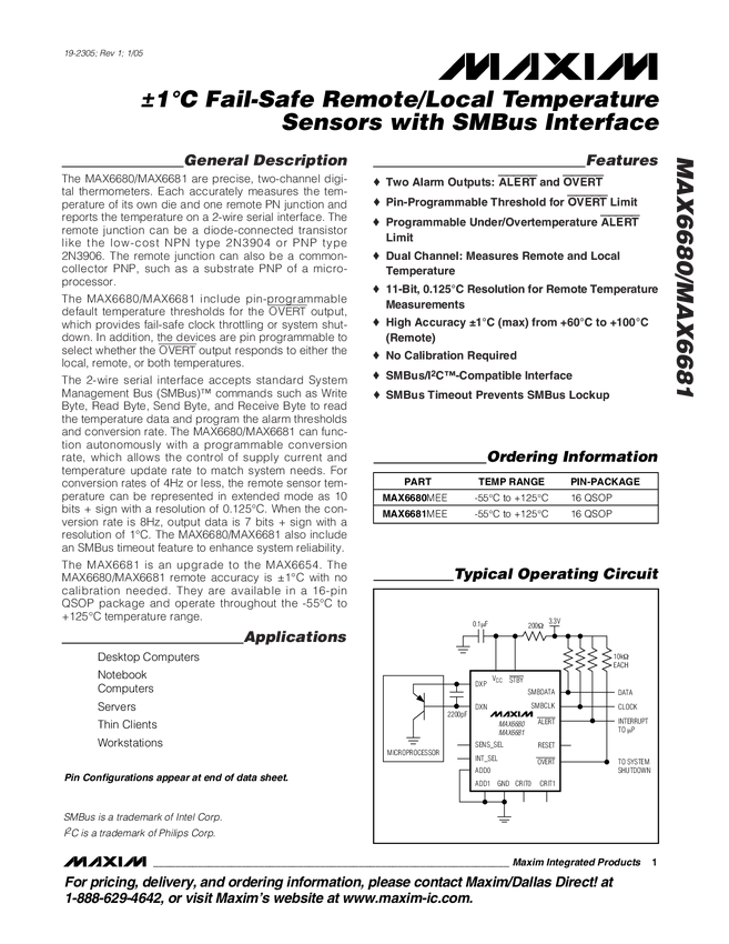 MAX6681 ±1°C Fail-Safe Remote/Local Temperature Sensors with SMBus Interface