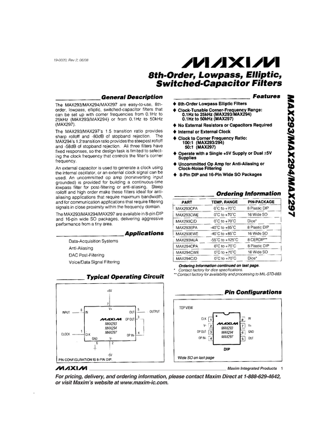 MAX293 8th-Order, Lowpass, Elliptic, Switched-Capacitor Filters