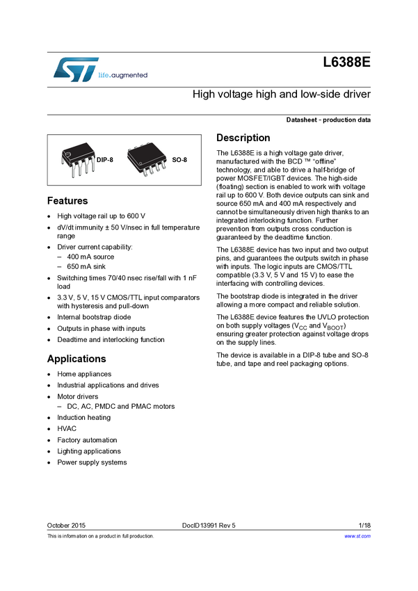 Układ scalony; L6388ED013TR; Dirver; 400mA; 580V; 750mW; 580V; 1 kanały; 400kHz; SO8; SMD; STMicroelectronics; RoHS