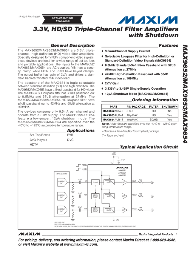 MAX9652 3.3V, HD/SD Triple-Channel Filter Amplifiers with Shutdown