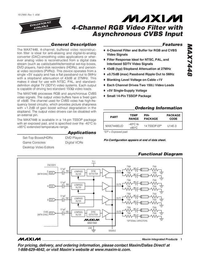 MAX7448 4-Channel RGB Video Filter with Asynchronous CVBS Input