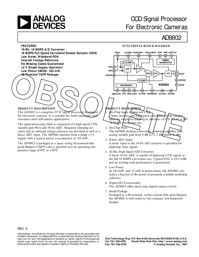 AD9802 10-Bit, 18 MSPS 1-Channel CCD Processor for Camcorder and Digital Still Cam...