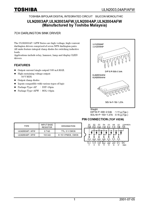 ULN2003A Układ scalony; ULN2003A; driver; darlington; 500mA; 50V; 7 kanałów; macierz...