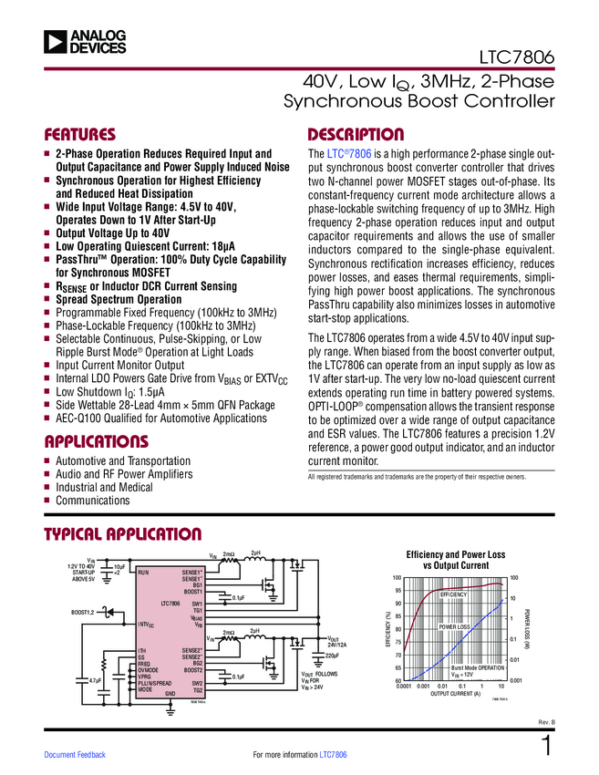 LTC7806 40V, Low I, 3MHz, 2-Phase Synchronous Boost Controller