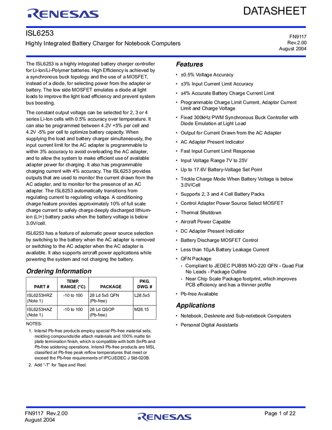 ISL6253 Highly Integrated Battery Charger for Notebook Computers