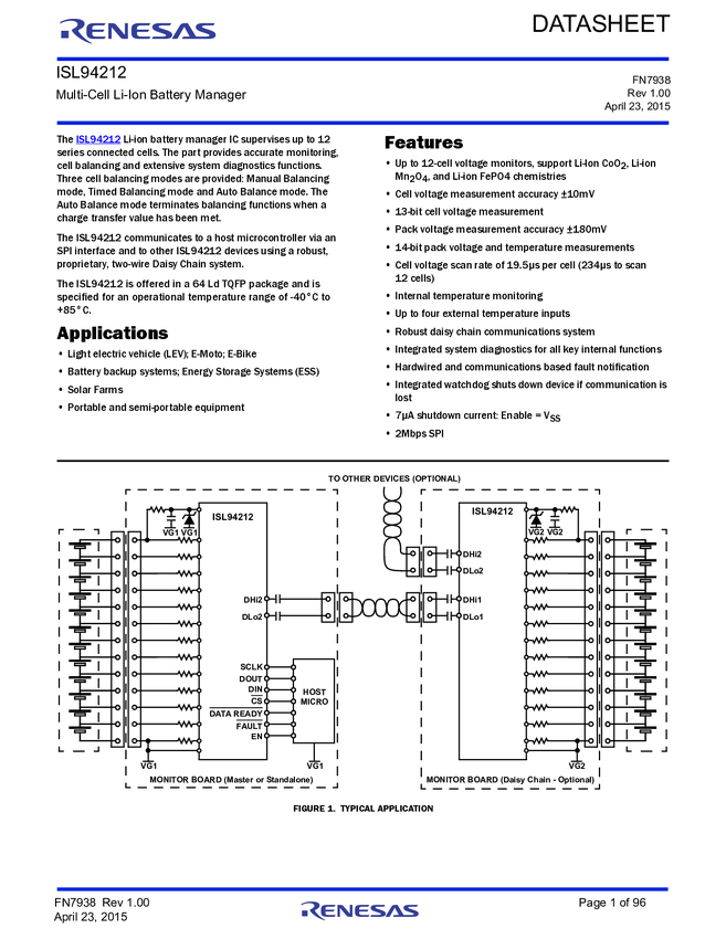 ISL94212 Multi-Cell Li-Ion Battery Manager
