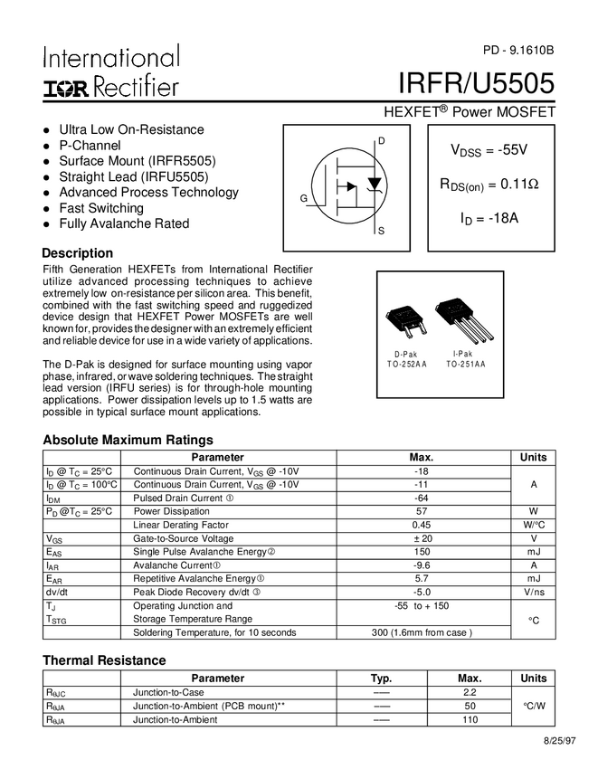 IRFR5505TRPBF Tranzystor; IRFR5505TRPBF; P-MOSFET; unipolarny; -55V; -18A; 57W; 0,11Ohm;...