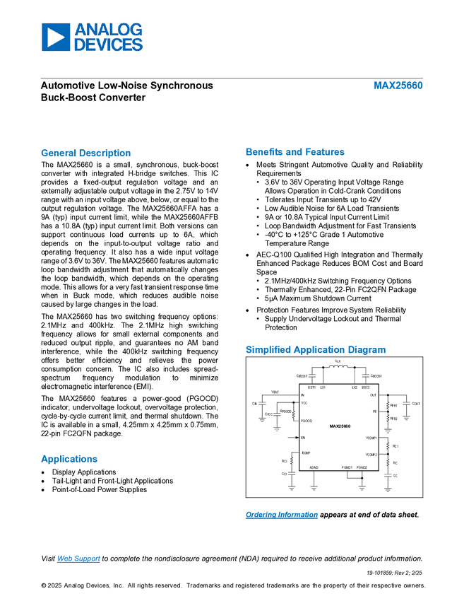 MAX25660 Automotive Low-Noise Synchronous Buck-Boost Converter