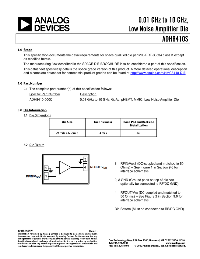 ADH8410S Aerospace 0.01 GHz to 10 GHz, GaAs, pHEMT, MMIC, Low Noise Amplifier