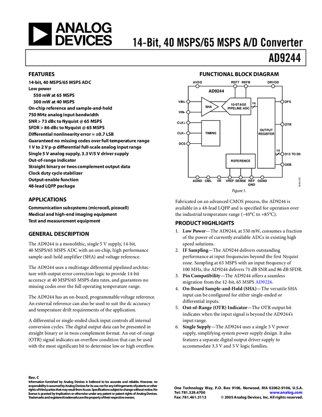 AD9244 14-Bit 40/65 MSPS IF Sampling Analog-To-Digital Converter