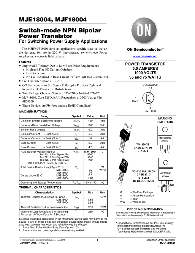 MJE18004 Tranzystor; MJE18004; NPN; 5A; 75W; 450V; bipolarny; TO220; THT; = NTE2333;...