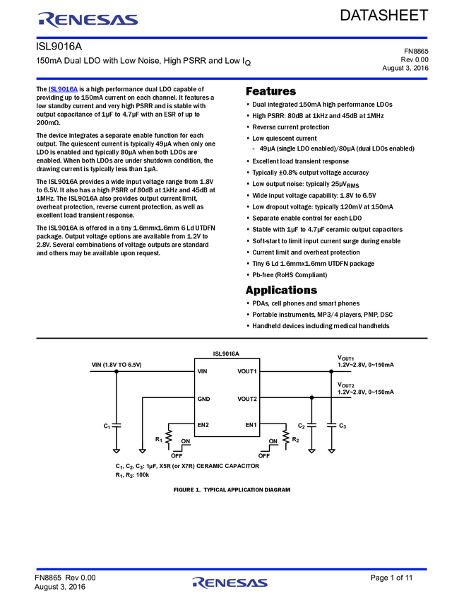 ISL9016A 150mA Dual LDO with Low Noise, High PSRR and Low IQ