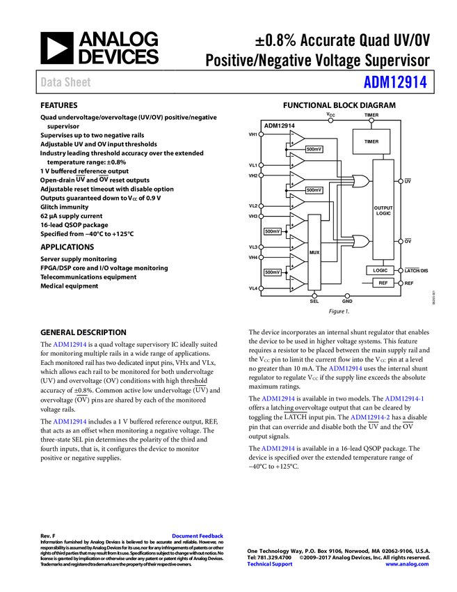 ADM12914 ±0.8% Accurate Quad UV/OV Positive/Negative Voltage Supervisor