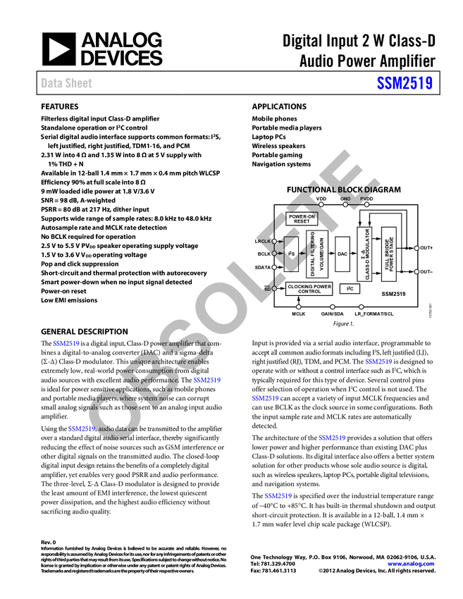 SSM2519 Digital Input 2 W Class-D Audio Power Amplifier