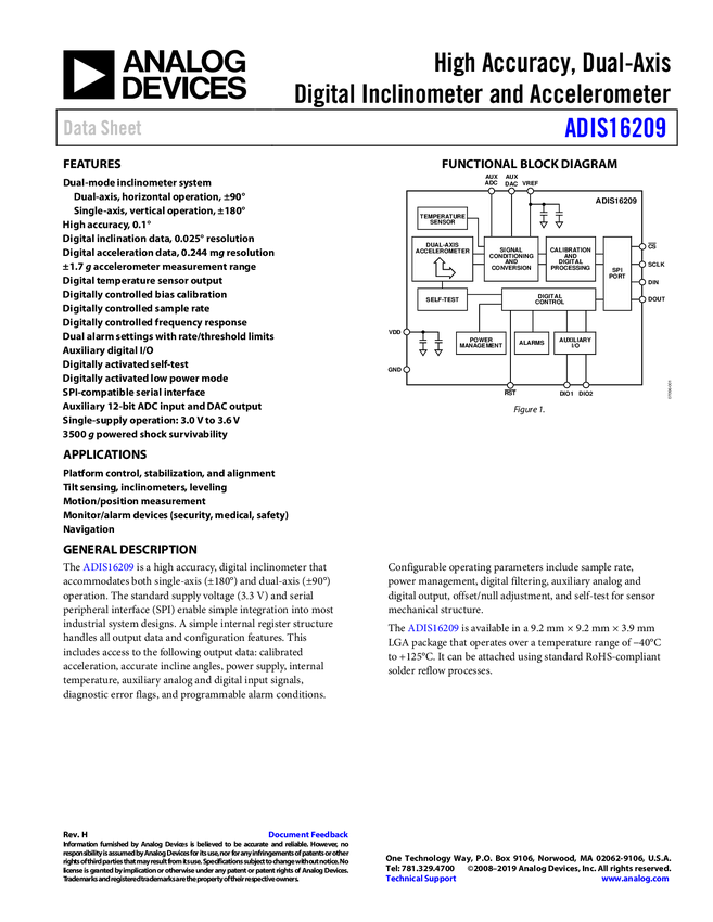 ADIS16209 High Accuracy, Dual-Axis Digital Inclinometer and Accelerometer