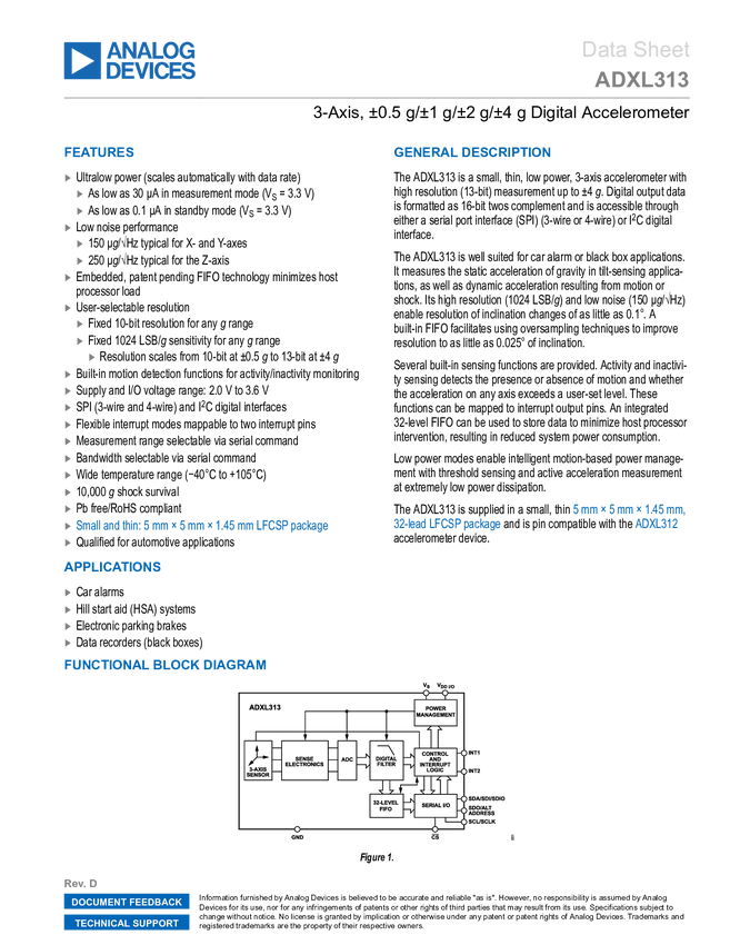 ADXL313 3-Axis, ±0.5 /±1 /±2 /±4 Digital Accelerometer