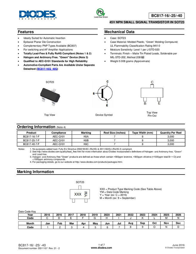 Tranzystor; BC817-40; NPN; 500mA; 50V; bipolarny; SOT23; SMD; HOTTECH; marking code 6CW; RoHS; opakowanie/100szt