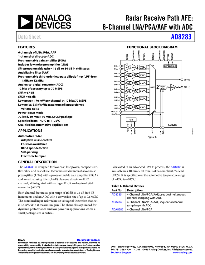 AD8283 Radar Receive Path AFE: 6-Channel LNA/PGA/AAF with ADC