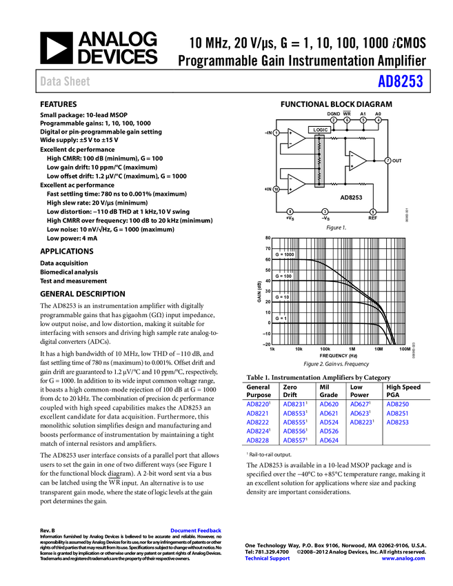 AD8253 10 MH, G = 1, 10, 100, 1000 CMOS® Programmable Gain Instrumentation Amplifi...