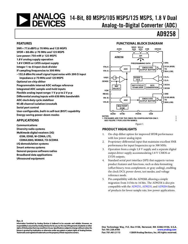 AD9258 14-Bit, 125 MSPS, 1.8 V Dual Analog-to-Digital Converter (ADC)