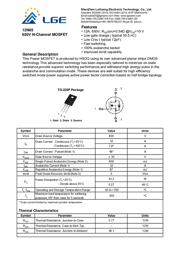 Tranzystor; 12N65; N-MOSFET; 12A; 650V; 33,2W; 540mOhm; TO220FP; THT; LUGUANG ELECTRONIC; RoHS