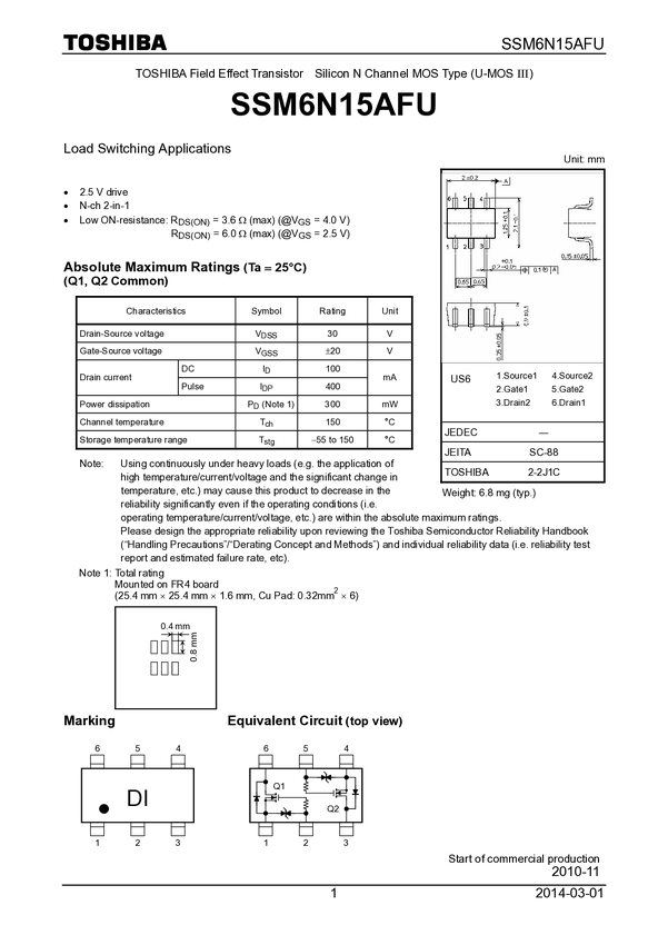 Tranzystor; SSM6N15FU(T5LFT); N-MOSFET x2; unipolarny; 30V; 0,1A; 0,3W; 6Ohm; SOT363; SMD; TOSHIBA; RoHS; op/100szt