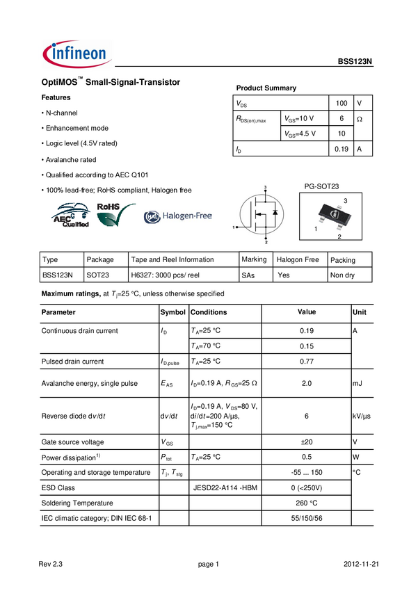 BSS123NH6327 Tranzystor; BSS123NH6327; N-MOSFET; 190mA; 100V; 500mW; unipolarny; logic l...