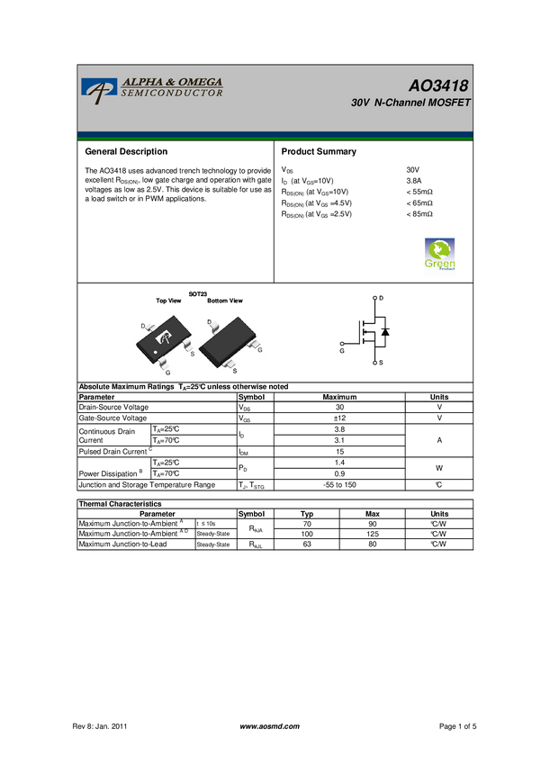 Tranzystor; AO3418; N-MOSFET; 3,1A; 1,4W; 30V; 55mOhm; SOT23; SMD; RoHS; ALPHA&OMEGA ;op/100szt