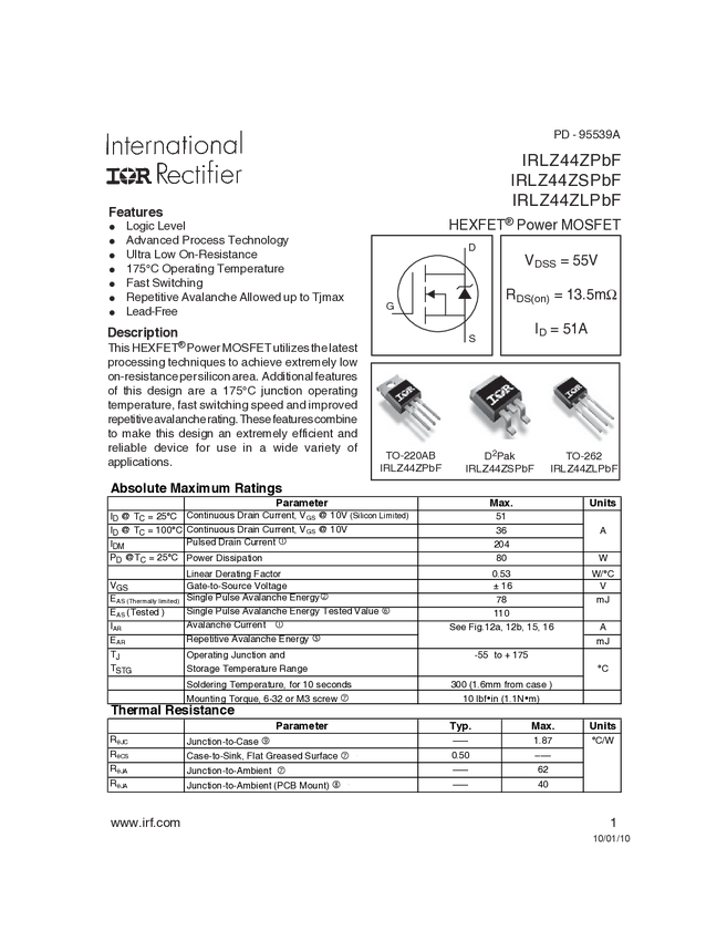 IRLZ44NS Tranzystor; IRLZ44NS; N-MOSFET; 47A; 55V; 110W; 22mOhm; unipolarny; logic l...