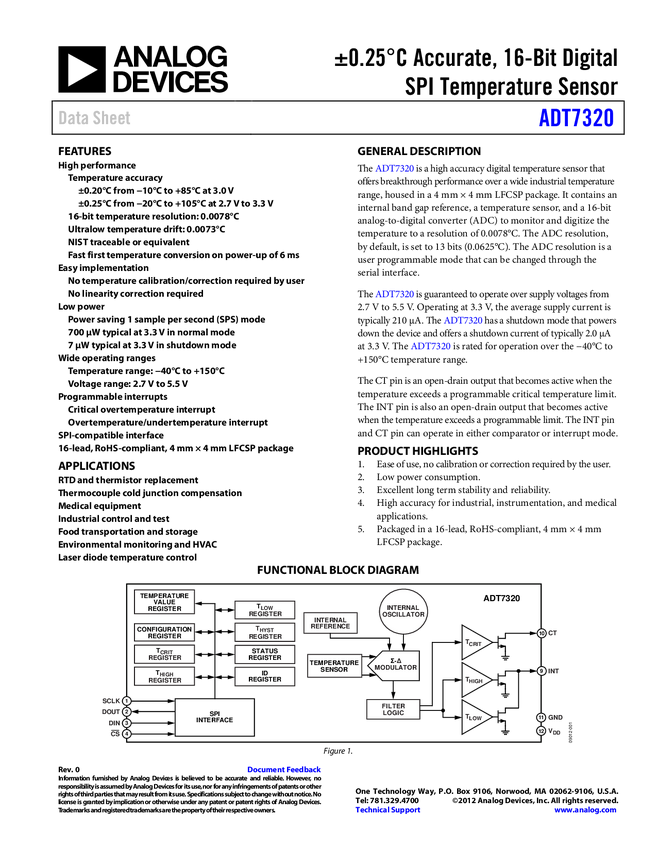 ADT7320 ±0.25°C Accurate, 16-Bit Digital SPI Temperature Sensor