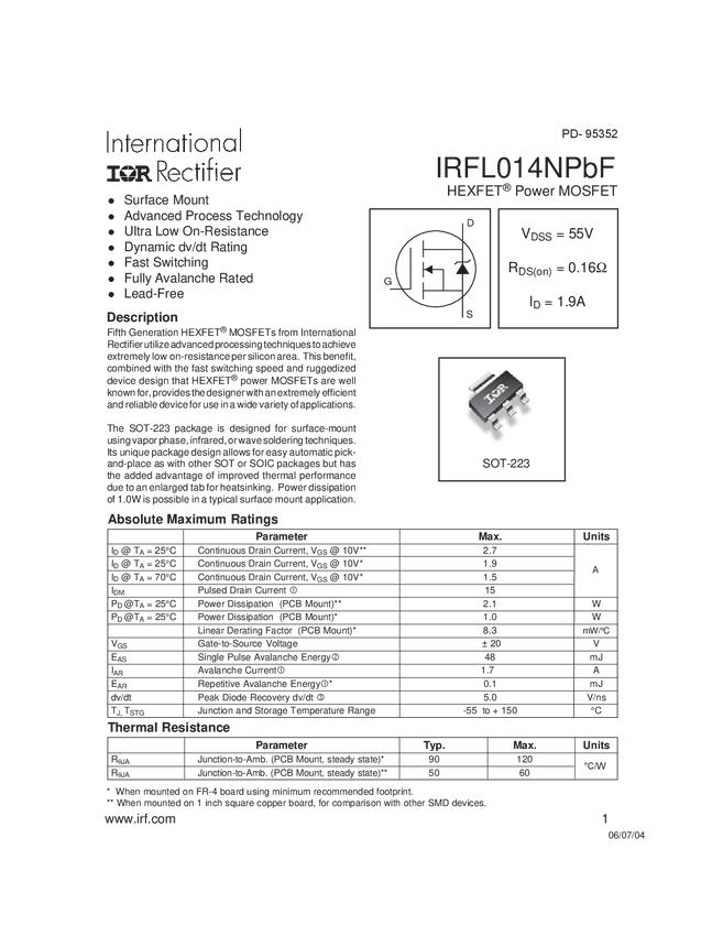 Tranzystor; IRFL014N; N-MOSFET 1,9A; 55V; 2,1W; unipolarny; SOT223; SMD; IRFL014NPBF; RoHS