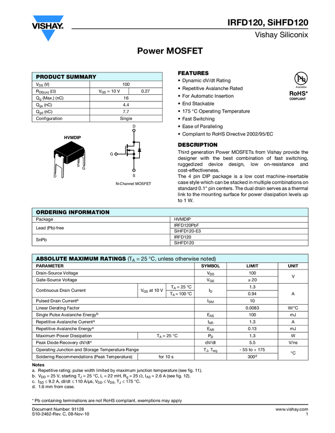 Tranzystor; IRFD120; N-MOSFET 1,3A; 100V; 1,3W; DIP4; THT; IRFD120PBF; SILICONIX; RoHS