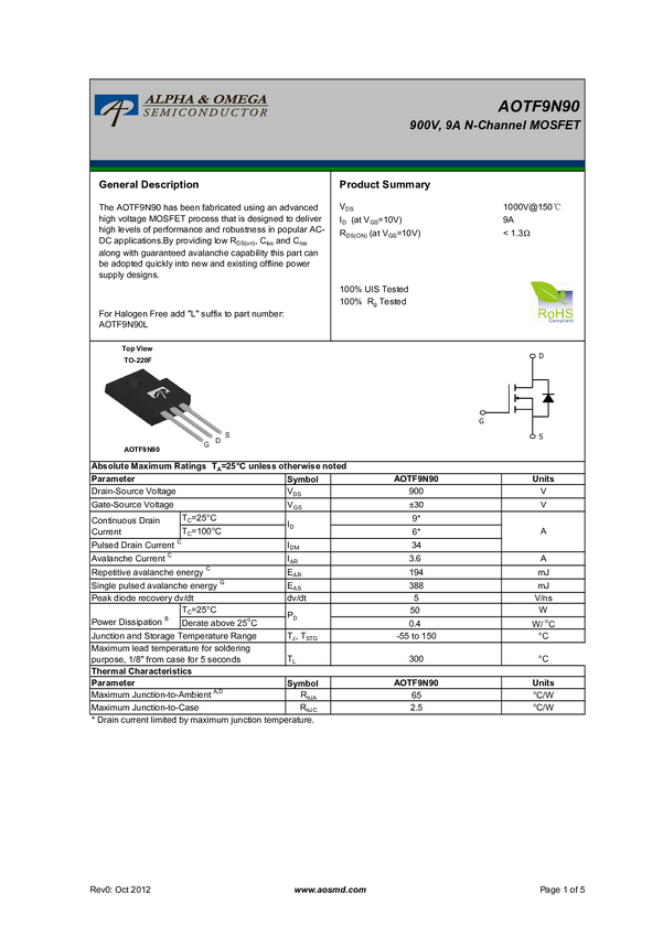 Tranzystor; AOTF9N90; N-MOSFET; 9A; 900V;50W; 1,3Ohm; unipolarny; TO220FP; THT; ALPHA & OMEGA; RoHS