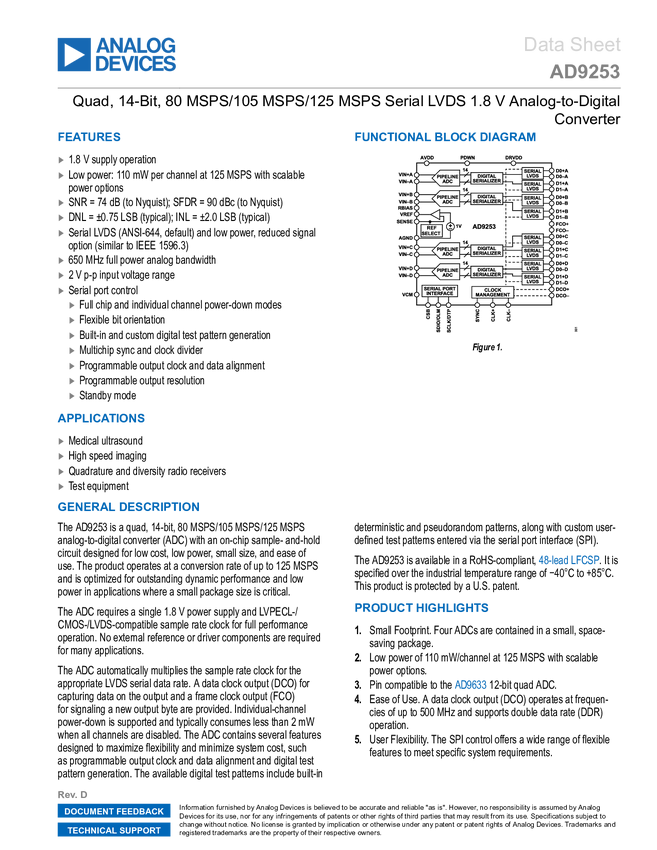 AD9253 Quad, 14-Bit, 80 MSPS/105 MSPS/125 MSPS Serial LVDS 1.8 V Analog-to-Digital...