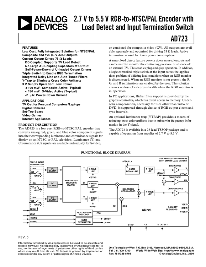 AD723 2.7 V to 5.5 V RGB-to-NTSC/PAL Encoder with Load Detect and Input Terminati...