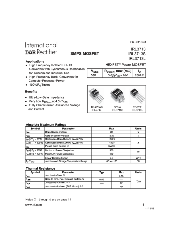 IRL3713PBF Tranzystor; IRL3713PBF; N-MOSFET; 260A; 30V; 330W; 3mOhm; unipolarny; logic...
