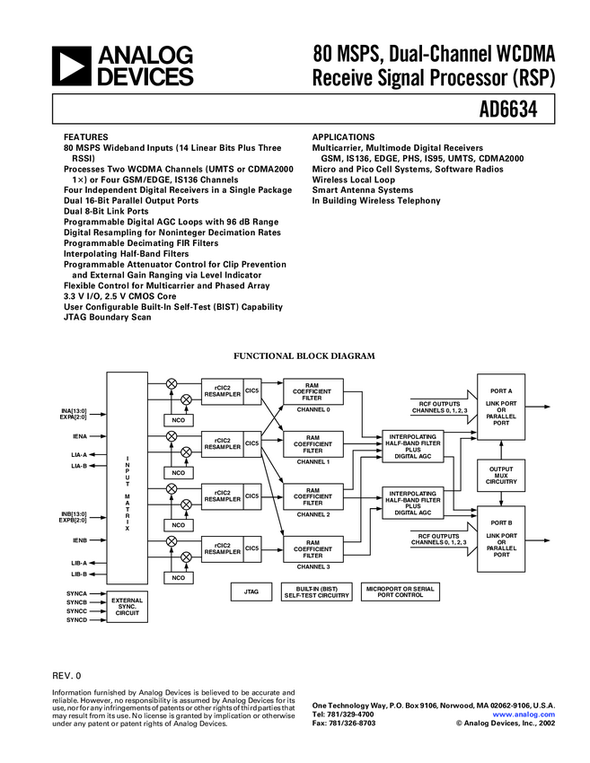 AD6634 80 MSPS, Dual-Channel, WCDMA Receive Signal Processor (RSP)