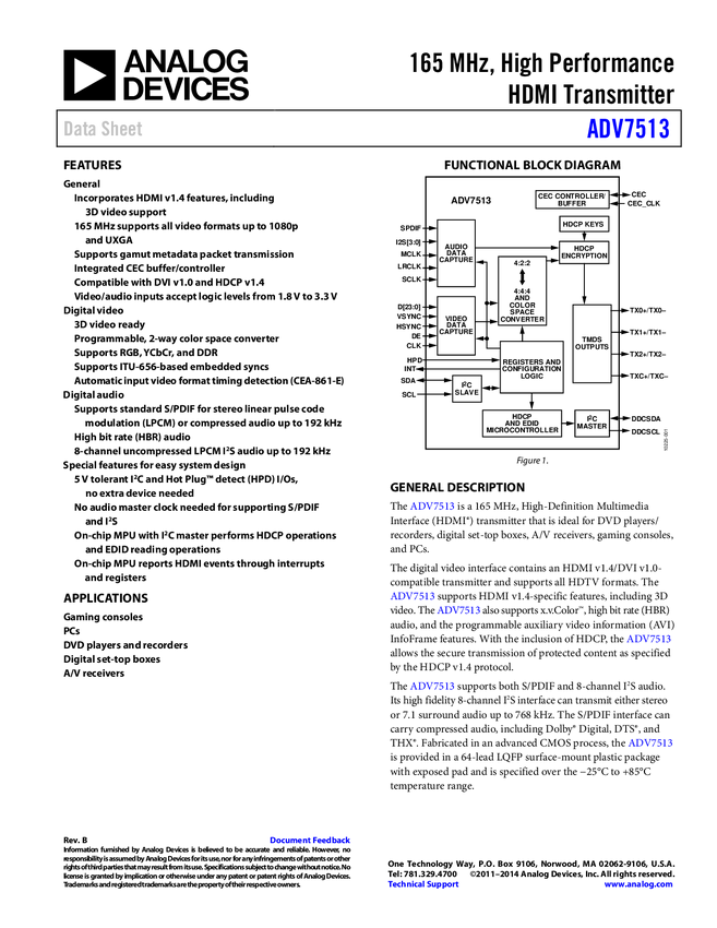 ADV7513 165 MHz High Performance HDMI Transmitter