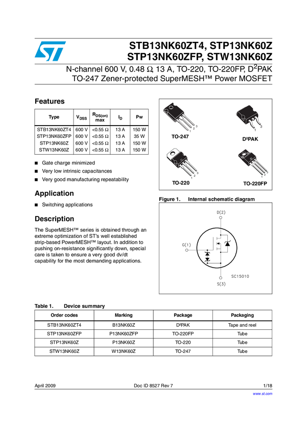 Tranzystor; STP13NK60ZFP; N-MOSFET; 8,2A; 600V; 35W; unipolarny; TO220FP; THT; ST Microelectronics; RoHS