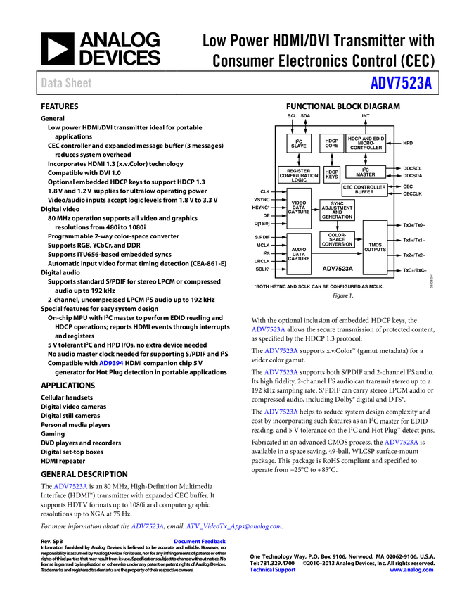 ADV7523A Low Power HDMI/DVI Transmitter with Consumer Electronic Control (CEC)