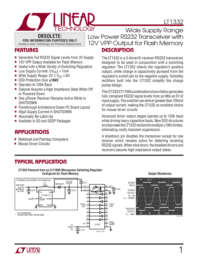 LT1332 Wide Supply Range Low Power RS232 Transceiver with 12V VPP Output for Flash...