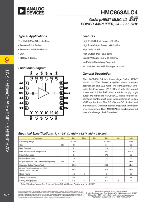 HMC863ALC4 GaAs pHEMT MMIC 1/2 Watt Power Amplifier, 24 - 29.5 GHz