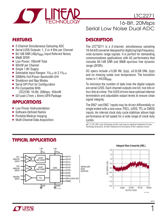 LTC2271 16-Bit, 20Msps Serial Low Noise Dual ADC