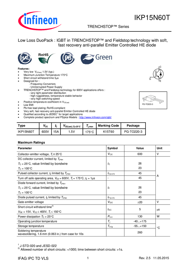 Tranzystor; IKP15N60TXKSA1; IGBT; 26A; 600V; 130W; TO220; THT; + dioda; = IRG4BC30KD; K15T60; INFINEON; RoHS