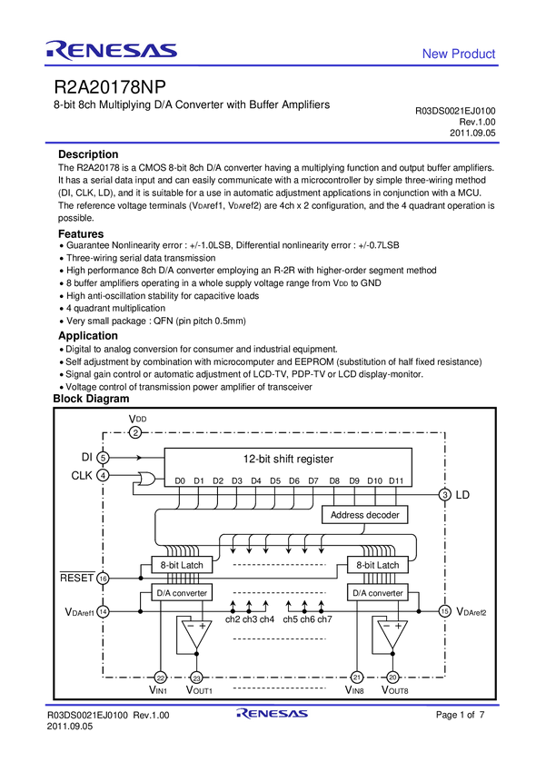 R2A20178NP 8-bit 8ch Multiplying D/A Converter with Buffer Amplifiers