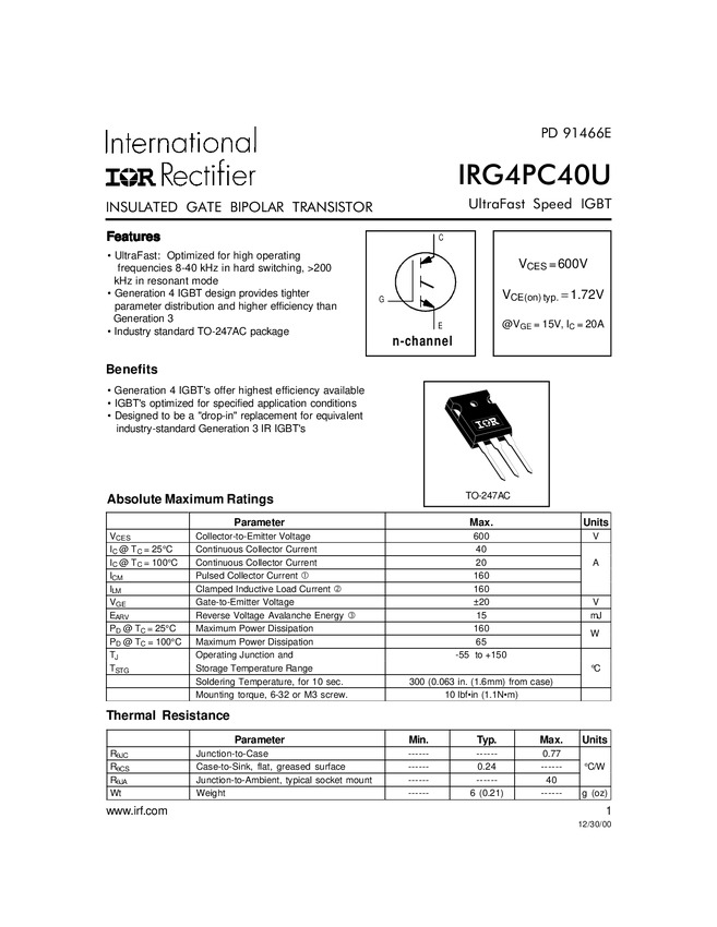 IRG4PC40U Tranzystor; IRG4PC40UPBF; IGBT; 40A; 600V; 160W; TO247AC; THT; INFINEON; Ro...
