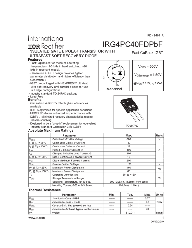 Tranzystor; IRG4PC40FD; IGBT +dioda; 49A; 600V; 160W; TO247; THT; INFINEON; IRG4PC40FDPBF; RoHS