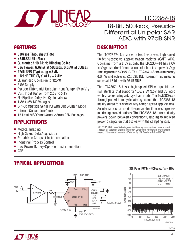 LTC2367-18 18-Bit, 500ksps, Pseudo-Differential Unipolar SAR ADC with 97dB SNR